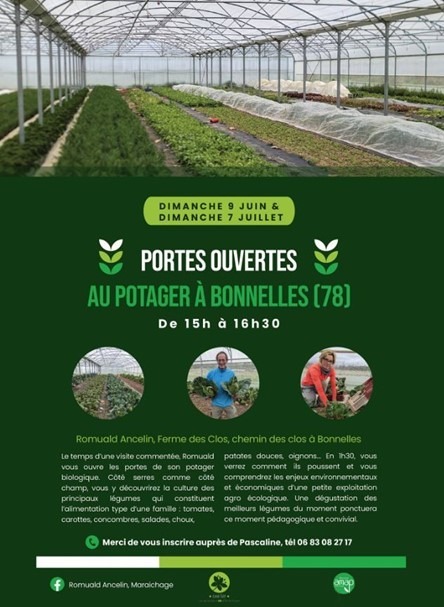 Romuald, agriculteur maraîcher, vous invite à venir découvrir son métier à la Ferme des Clos les dimanche 9 juin et dimanche 7 juillet de 15h00 à 16h30. Avec Pascaline, ils vous feront découvrir leur métier, leurs cultures et leur passion de l’agriculture. Pour participer, s’inscrire auprès de Pascaline : 06 83 08 27 17.