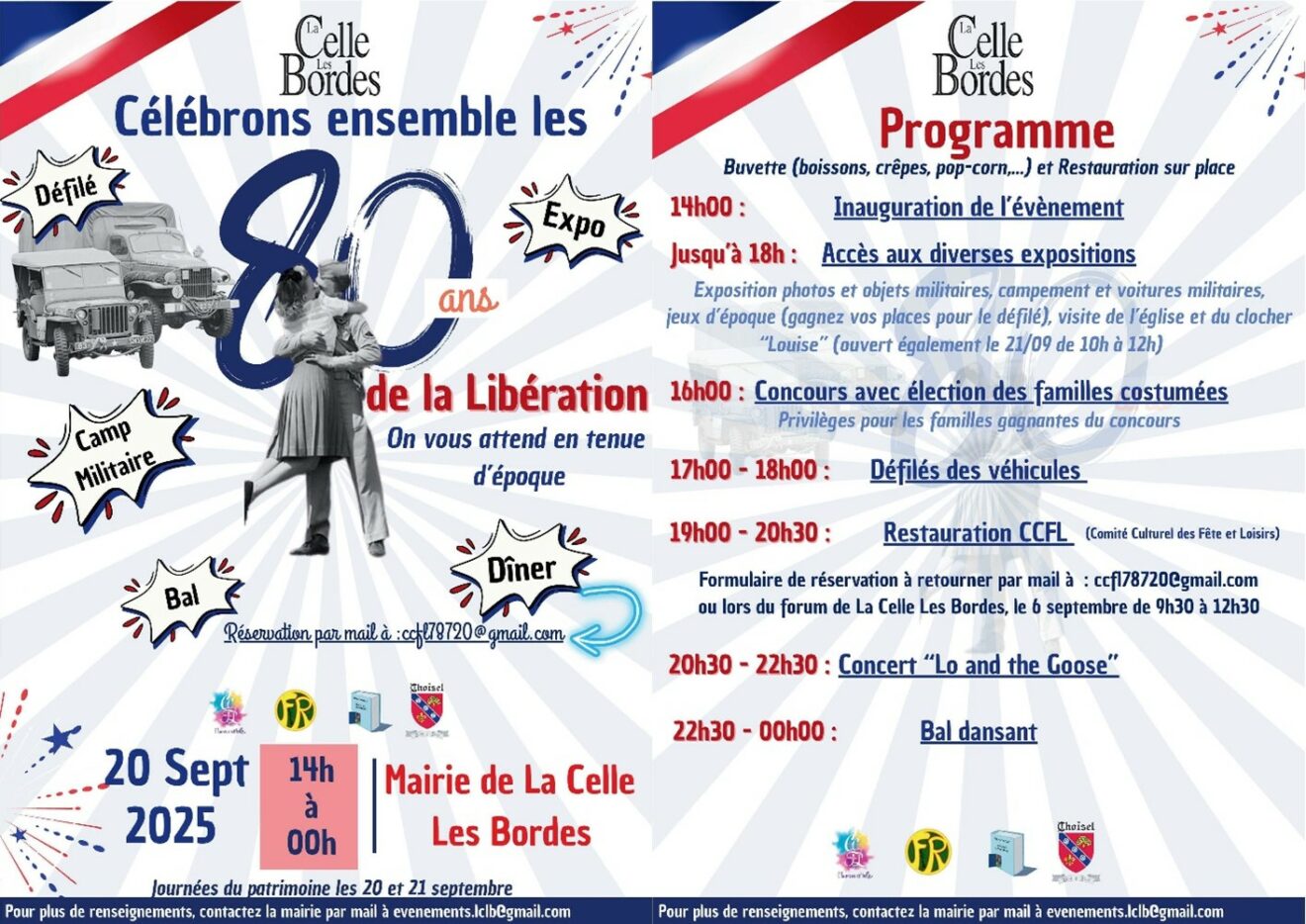 La Commune de la Celle Les Bordes nous convie à la cérémonie de commémoration du 80ème anniversaire de la Libération le samedi 20 septembre 2025 à partir de 14h00. Cette commémoration est jumelée avec les Journées du Patrimoine.