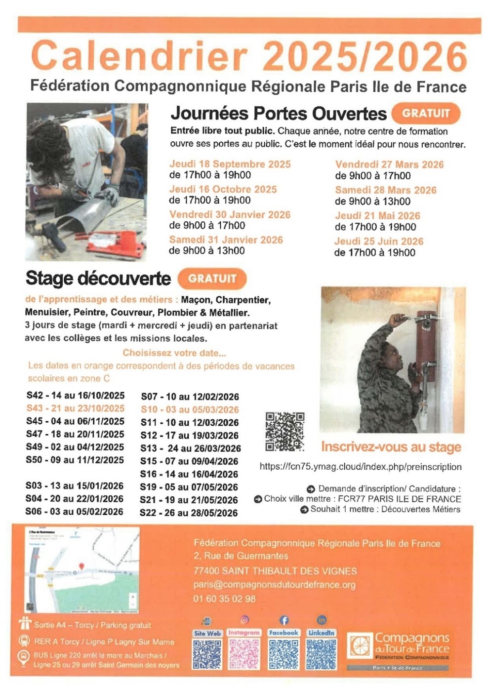 C’est l’occasion pour tous de découvrir l’ensemble des formations proposées par les Compa-gnons du Tour de France, les ateliers et échanger avec les professionnels du métier. Plus proche de chez nous, cet évènement aura lieu le jeudi 18 septembre 2025 de 17h00 à 19h00 au 02 rue de Guermantes 77 400 SAINT THIBAULT DES VIGNES.