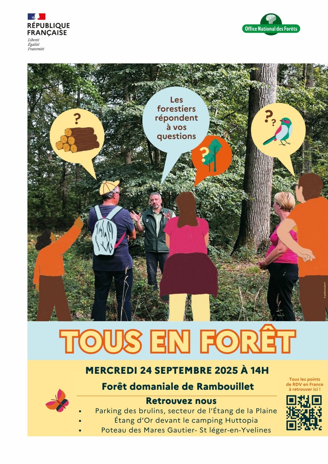 Le mercredi 24 septembre 2025, l’Office national des forêts vous donne rendez-vous pour la 5แต édition de l’opération "Tous en forêt !", un événement incontournable de la rentrée pour tous les amoureux de la nature. À cette occasion, le grand public est invité à partir à la rencontre des femmes et des hommes qui œuvrent chaque jour à la gestion durable de nos forêts. Au programme : des balades commentées, accessibles sans inscription, pour découvrir les coulisses de la forêt et échanger avec les forestiers. En forêt domaniale de Rambouillet, des balades auront lieu à partir de 14h à trois points d’accueil : • Parking ONF des Brulins – Montfort L’Amaury • Parking de l’Étang d’Or devant le camping Huttopia – Rambouillet • Poteau des Mares Gautier – Saint-Léger-en-Yvelines ๐ Retrouvez l’ensemble des localisations ici : https://maps.app.goo.gl/hgrKNTDjt5