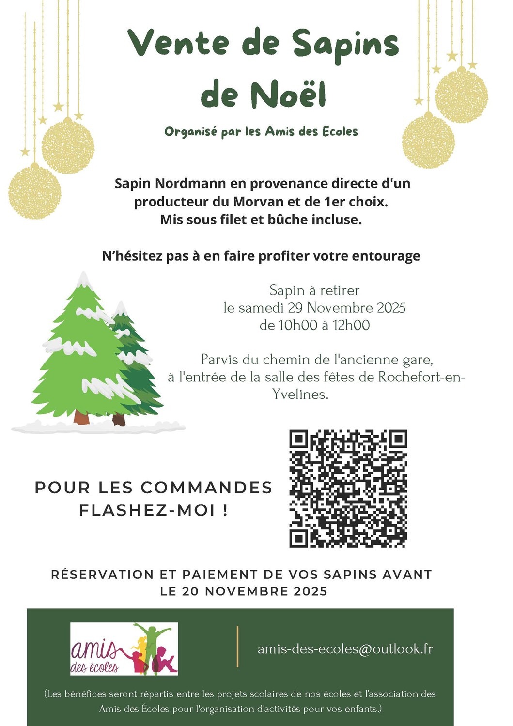 L’association des Parents d’élèves LES AMIS DES ECOLES (AME) nous invitent à préparer Noël avec eux. Ils nous proposent d’acheter nos sapins (à commander avant le 20 novembre et à récupérer le 29 novembre) et de remplir nos hottes de cadeaux grâce au Marché de Noël qui se déroulera le samedi 13 décembre, dans l'enceinte de l'école élémentaire de Rochefort-en-Yvelines de 17h00 à 20h00. Petite demande particulière : pour que le marché de Noël soit un succès, les AME sont à la recherche d'un Père Noël qui pourrait venir à la rencontre des enfants aux alentours de 17h pour le plus grand plaisir des petits et des plus grands !