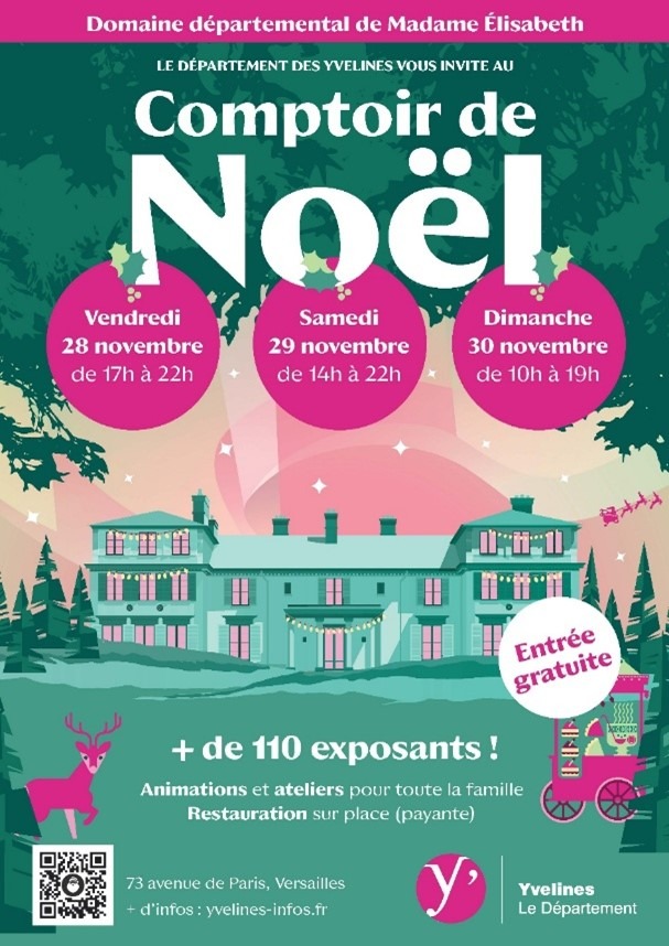 Le Département des Yvelines vous invite à plonger dans la magie de Noël au Domaine dé-partemental de Madame Élisabeth, du vendredi 28 au dimanche 30 novembre 2025. Au programme : - Plus de 110 exposants - Des animations et ateliers pour toute la famille : ateliers créatifs, déambulations dansées, ateliers nature en extérieur, maquillage, spectacles. Ateliers et jeux à réserver sur place, dans la limite des places disponibles. - Restauration sur place (payante) - Une ambiance festive et conviviale pour petits et grands !