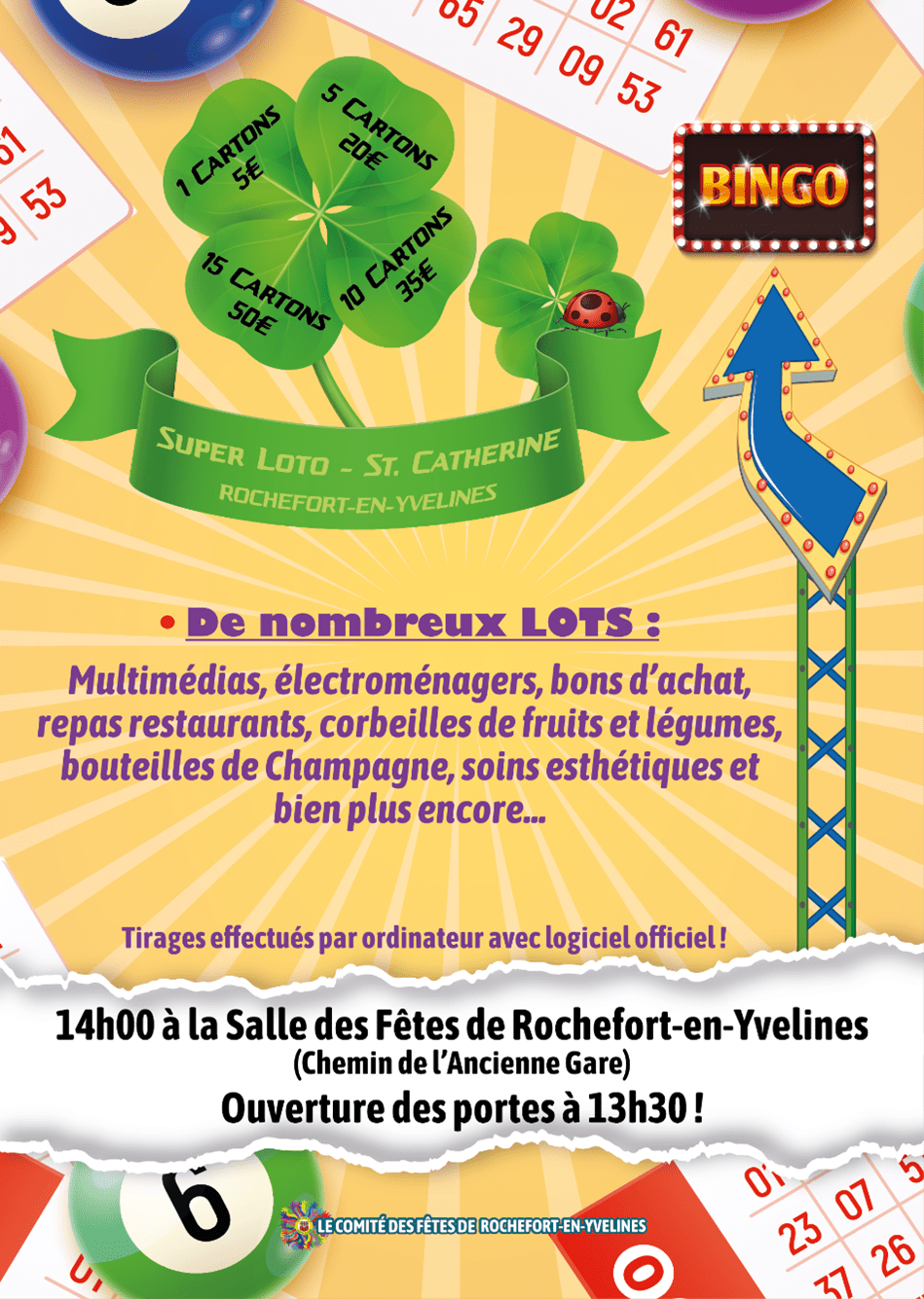Le comité des fêtes de Rochefort-en-Yvelines vous invite à tenter votre chance ce dimanche 23 novembre à partir de 13h30 à la salle des fêtes du village. De beaux lots et cadeaux à gagner. Venez nombreux !