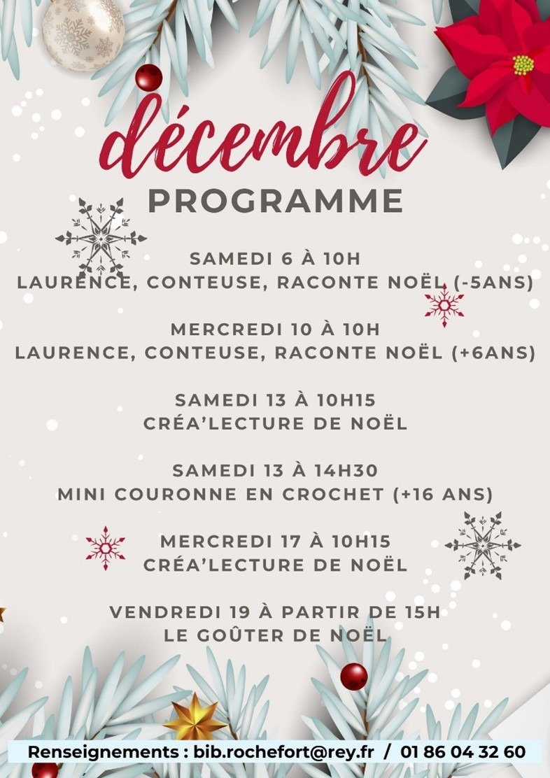 Sylvie Thirion, notre nouvelle bibliothécaire, invite toutes celles et ceux qui ont des décora-tions de Noël en bon état dont ils veulent se débarrasser à venir les déposer à la biblio-thèque aux horaires d’ouverture. Guirlandes, boules, personnages, tissus…sont les bienvenus. Pour convenir d’un rendez-vous en dehors des horaires d’ouverture : bib.rochefort@rey78.fr