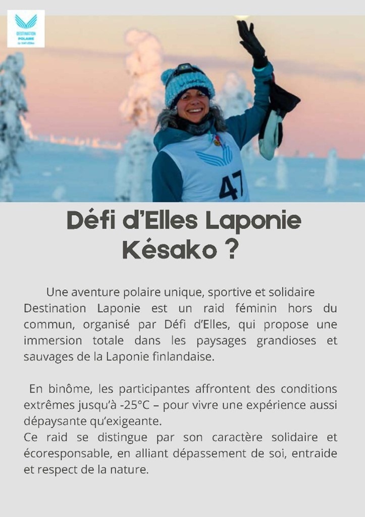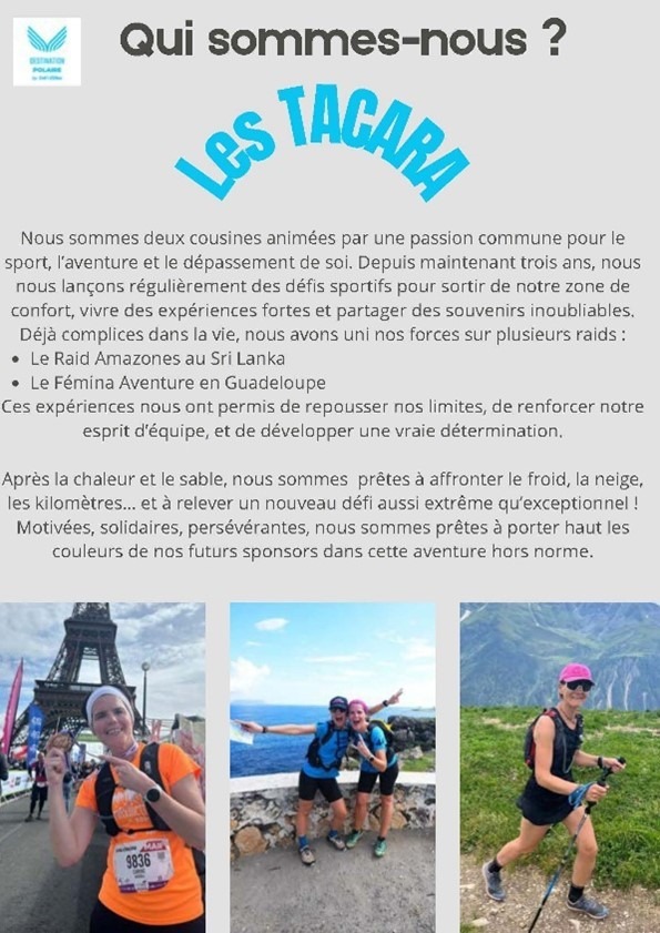 Découvrez leur nouveau projet grâce au dossier de présentation ci-joint, soutenez-les en cliquant sur ce lien Les Tacara - Defi D’Elles Laponie 2026 et suivez leur parcours grâce à leur comptes Instagram et Facebook. Tous avec Les Tacara !