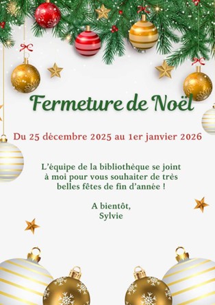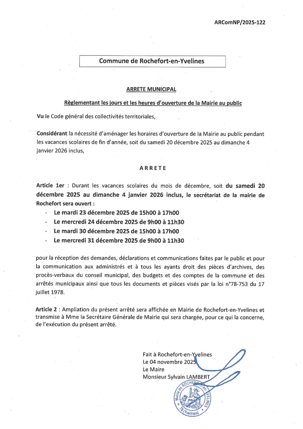 Conformément à l’arrêté municipal ARComNP/2025-122 ci-joint, nous vous remercions de noter les horaires d’ouverture de la mairie de Rochefort-en-Yvelines pour la durée des vacances de fin d’année : - Mardi 23 décembre 2025 de 15h00 à 17h00 - Mercredi 24 décembre 2025 de 9h00 à 11h30 - Mardi 30 décembre 2025 de 15h00 à 17h00 - Mercredi 31 décembre 2025 de 9h00 à 11h30