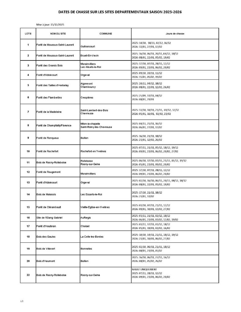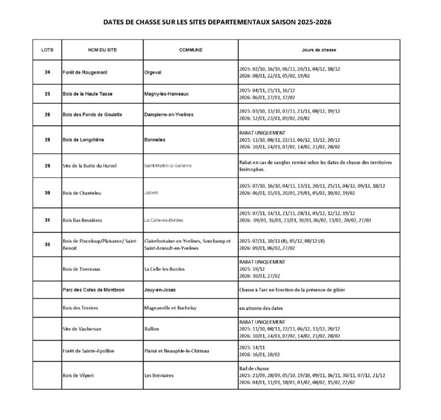 Les calendriers de chasse des espaces naturels sensibles départementaux ont été mis à jour dans le cadre de la saison 2025-2026. Ce tableau annule et remplace le précédent tableau : • Lot n°17 -Bois d’Houlbran (Choisel) : La date du 15 décembre a été remplacée par le jeudi 18 décembre. • Bois de Tivernoux (La celle-les-Bordes) : 3 dates de rabat seront organisées les 19 décembre 2025, 30 janvier 2026 et 27 février 2026.