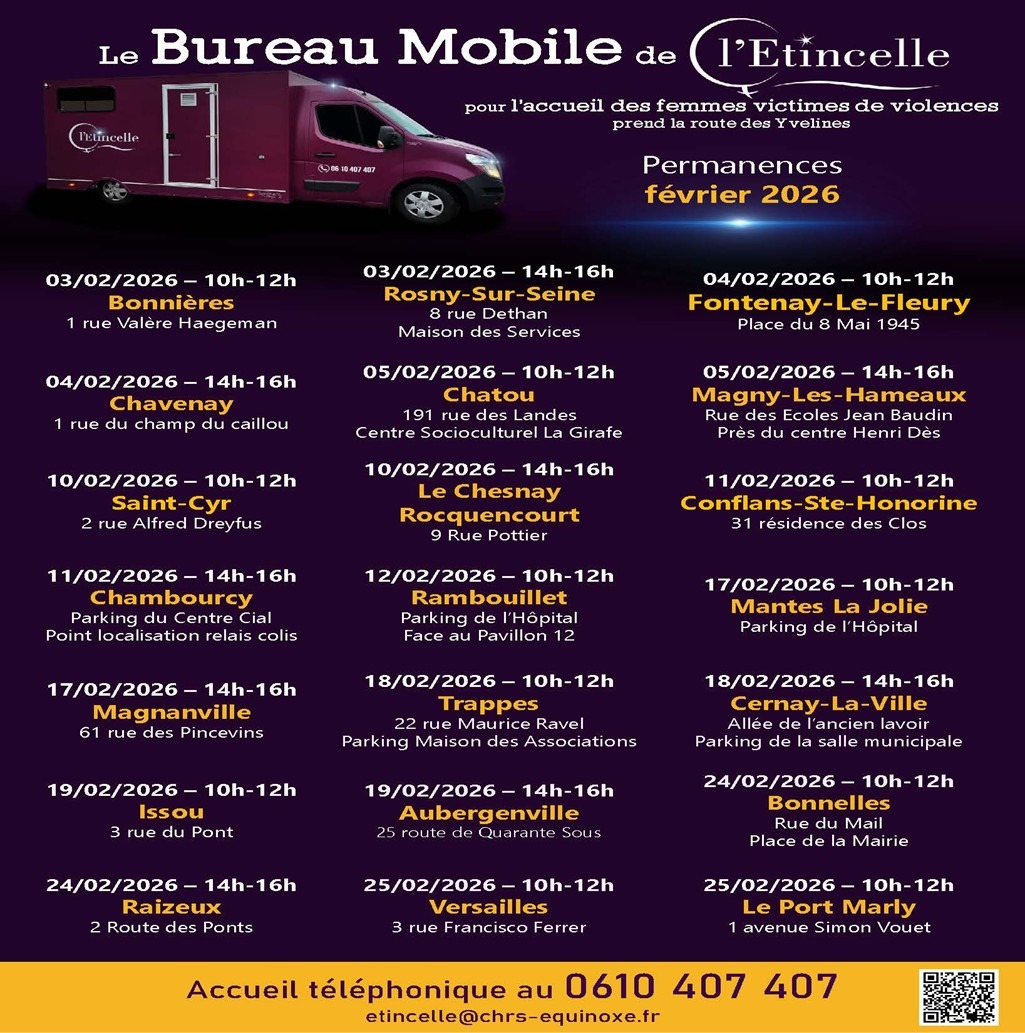 Les femmes victimes de violences intrafamiliales peuvent trouver écoute et conseil lors des permanences du Bureau Mobile de l’Etincelle. Retrouvez son planning du mois de février avec quelques dates de permanences proches de Rochefort-en-Yvelines : - Jeudi 12 février, à Rambouillet de 10h00 à 12h00 - Mercredi 18 février, à Cernay-la-Ville de 14h00 à 16h00 - Mardi 24 février, à Bonnelles, de 10h00 à 12h00