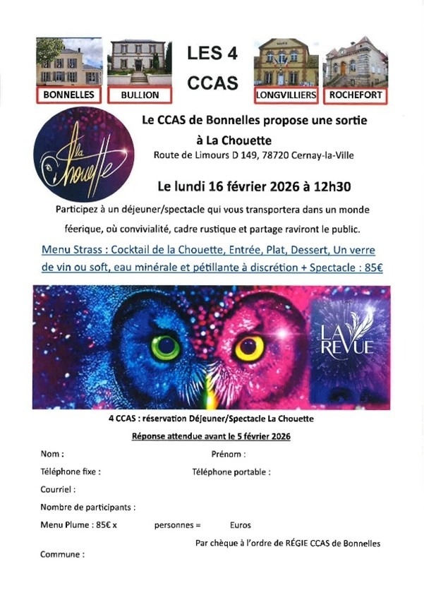 Dans le cadre des 4 CCAS (Bullion, Bonnelles, Longvilliers et Rochefort-en-Yvelines), la ville de Bon-nelles organise un déjeuner spectacle au cabaret La Chouette de Cernay-la-Ville pour les aînés de 65 ans et plus des 4 communes, le lundi 16 février à 12h30. Pour s’inscrire, merci de retourner le flyer ci-joint à la mairie.
