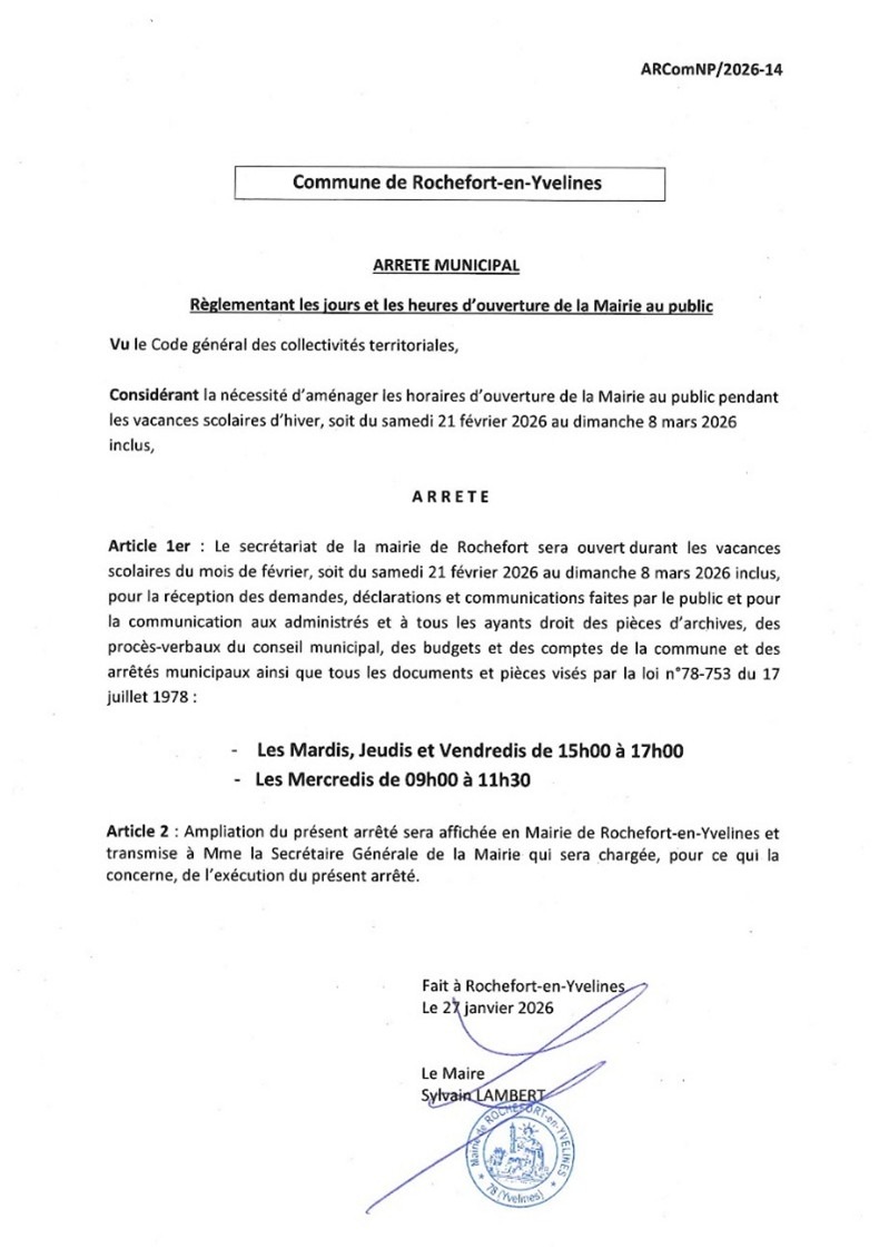 Conformément à l’arrêté municipal AR/ComNP/2026-14 en date du 27 janvier 2026, la mai-rie de Rochefort-en-Yvelines sera ouverte du samedi 21 février au dimanche 8 mars au pu-blic - Les mardis, jeudis et vendredis, de 15h00 à 17h00 - Les mercredis de 9h00 à 11h30