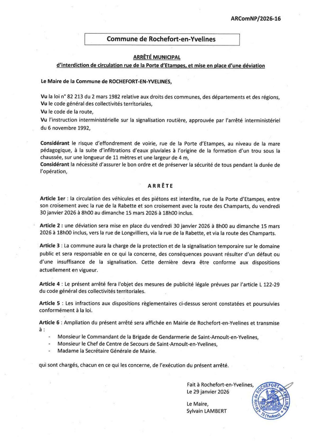 Arrêté d’interdiction de circulation ARComNP/2016-16 - Rue de la Porte d’Etampes