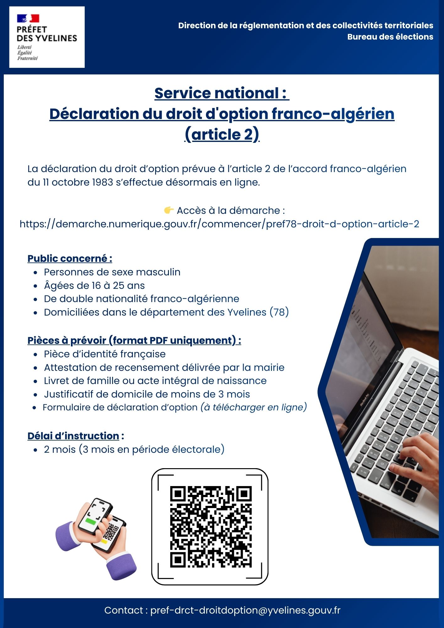 Le bureau des élections de la préfecture des Yvelines assure le traitement des déclarations du droit d’option franco-algérien prévues à l’article 2 de l’accord du 11 octobre 1983.